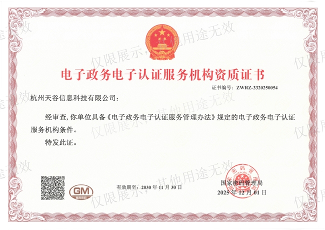 近日,e签宝(天谷CA)通过国家密码管理局的资质审查,获颁《电子政务电子认证服务机构资质证书》(政务CA证书)。